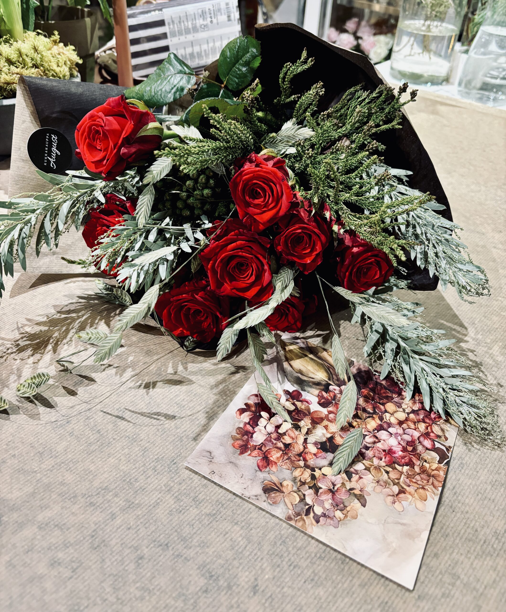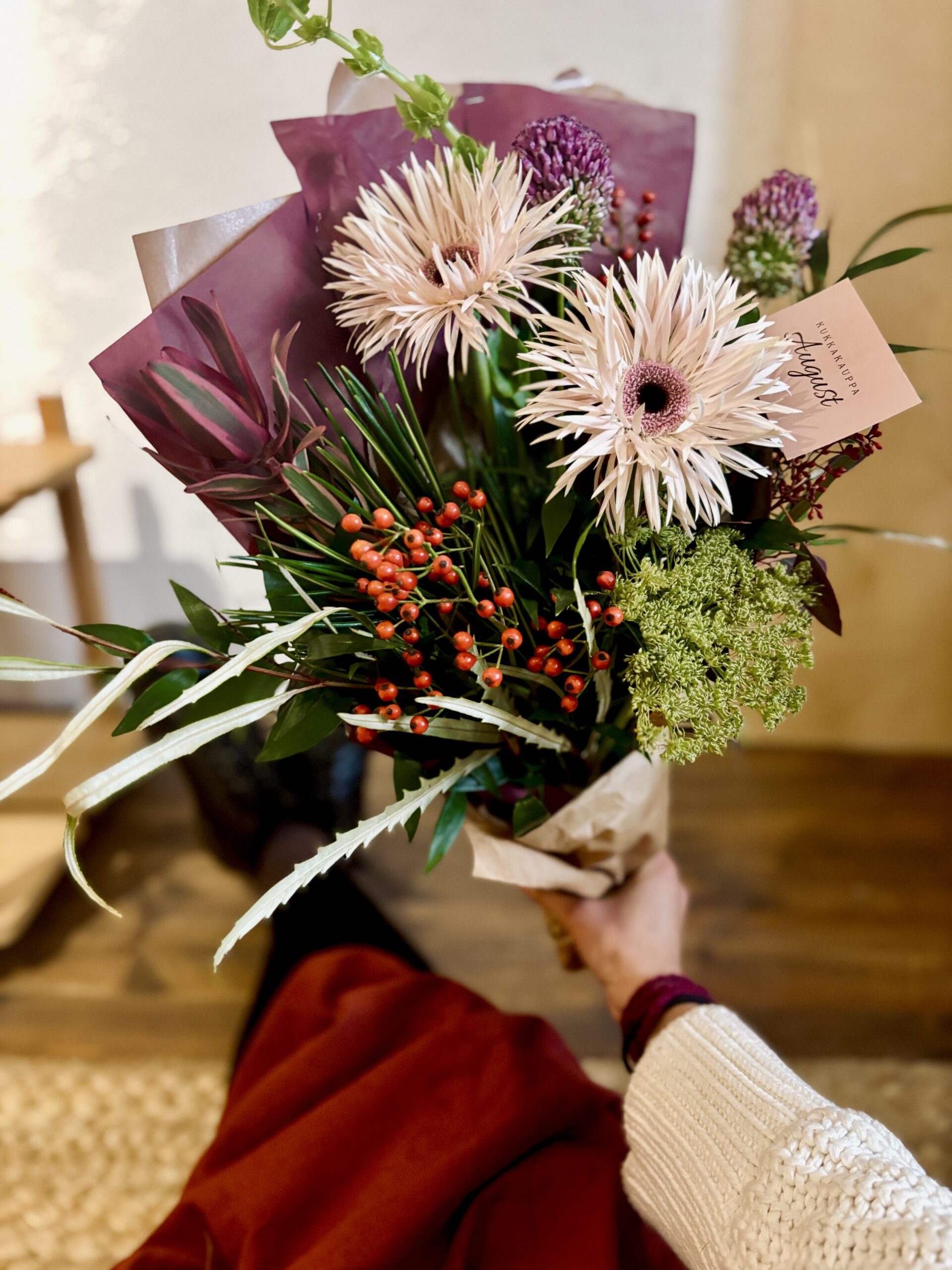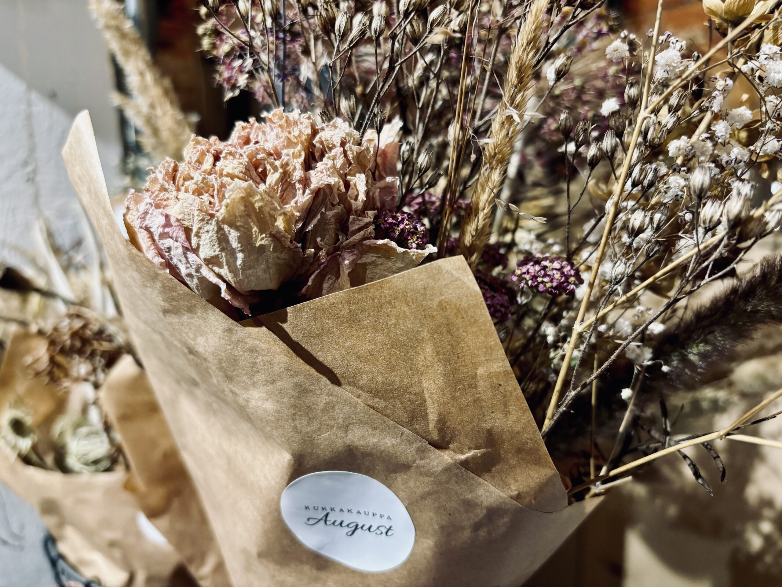 Löydät täältä kuvia tuotevalikoimastamme ja tehdyistä töistämme. Näet täältä myös tuotenumeron ja suuntaa antavaa hintaa tuotteille. Sidomme kimput ja teemme asetelmat aina saatavilla olevista kauden kukista. Jos löydät täältä mieluisan tuotteen, voit olla yhteydessä meihin. Kuuntelemme mielellään toiveitasi!